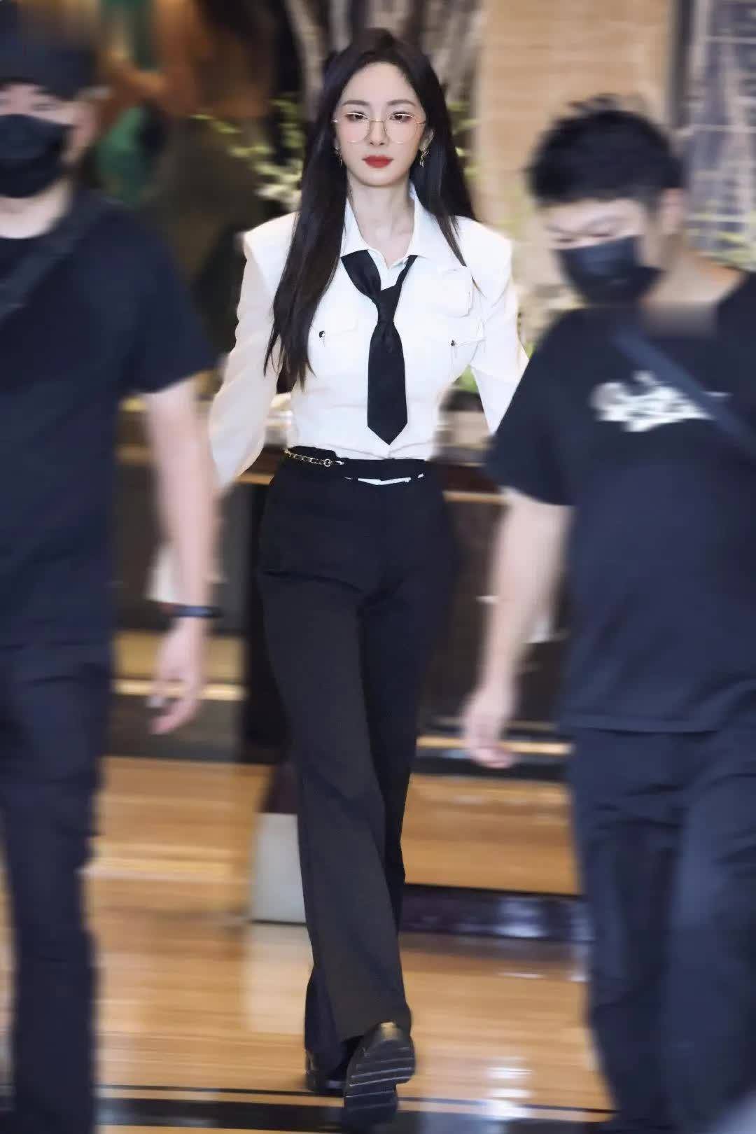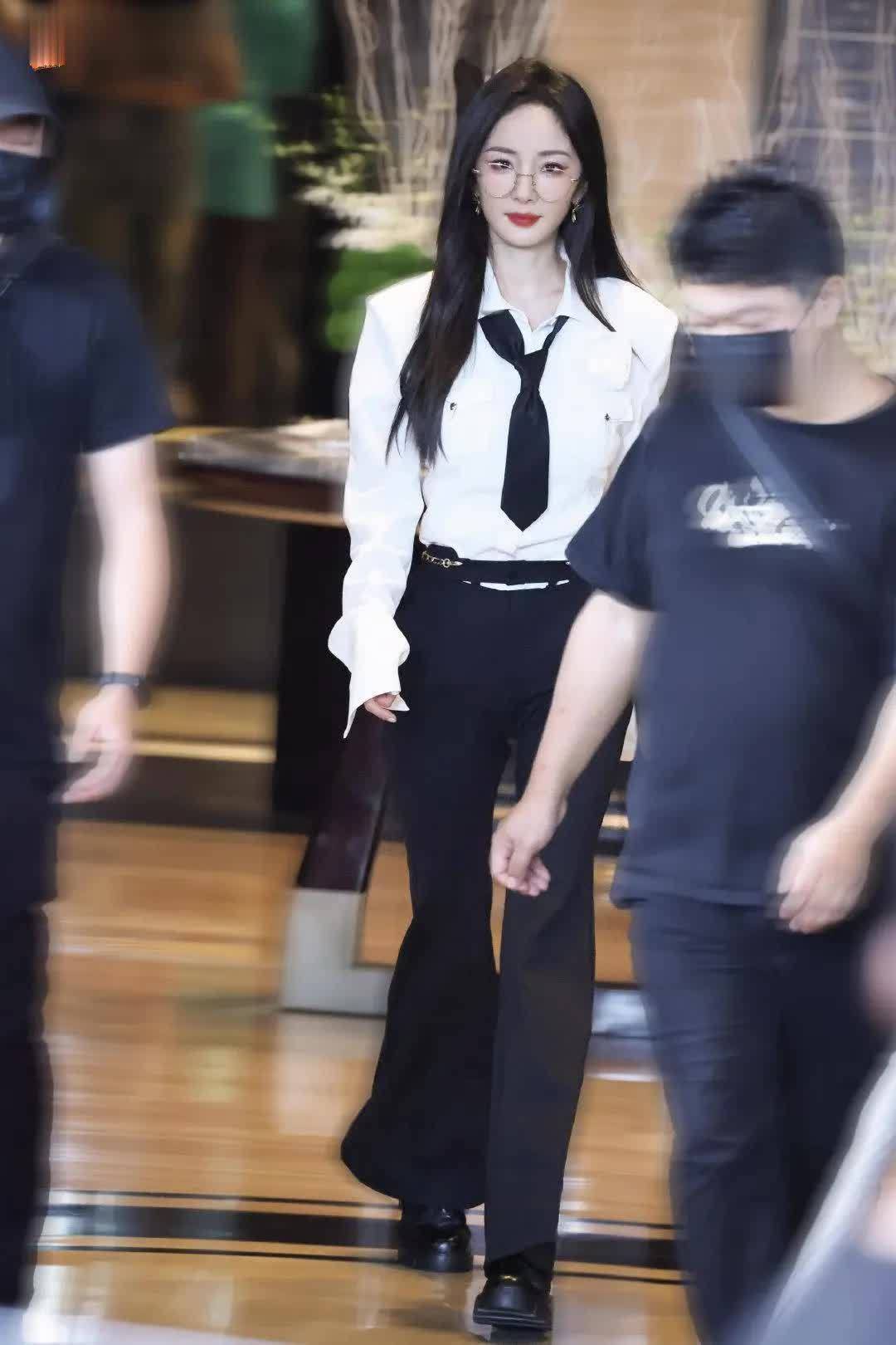 1986 年的杨幂,在时尚领域的复古风潮中总能占据一席之地。这套白衬衫、黑领带搭配黑色喇叭裤的穿搭,充满了复古韵味,白色衬衫的复古口袋设计与她的玲珑身姿相得益彰,黑色领带的经典元素为造型增添了优雅气息,黑色喇叭裤的复古剪裁则让她的腿部线条更加迷人,整体学院风套装又雅又吸睛,成为时尚圈的又一经典造型。
